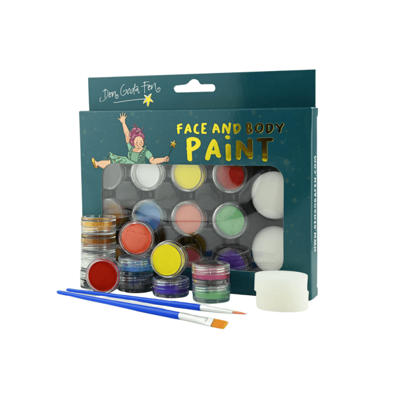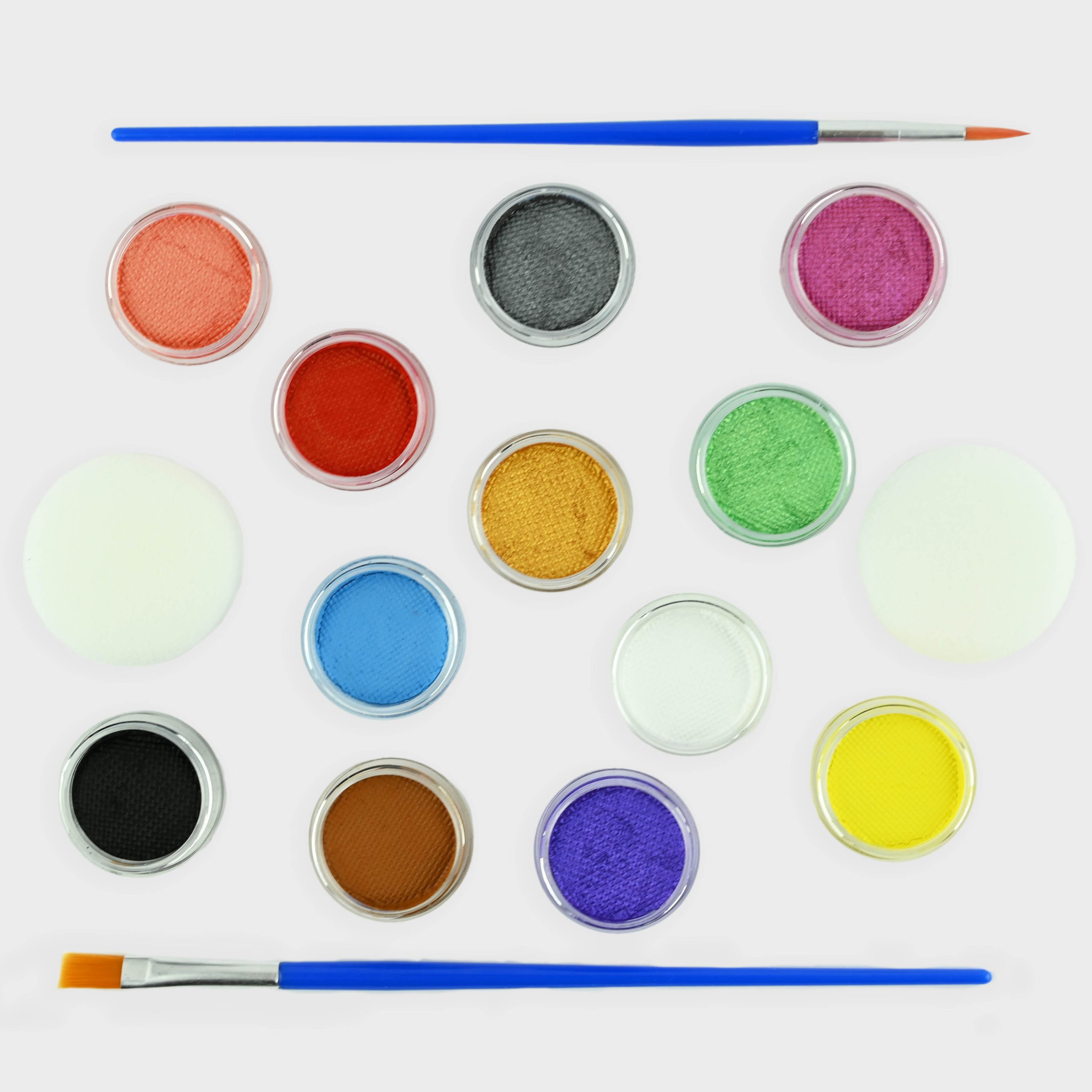 - 6 colores de pintura facial brillante a base de agua 4 gr cada uno: Oro, plata, naranja, verde, rosa y morado.