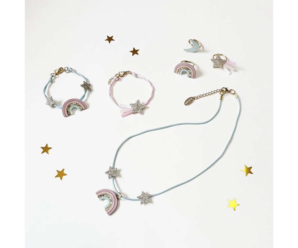 Añadir a la lista de DeseosConjunto de tres anillos, que incluyen un bonito arcoíris en colores pastel, una luna y una estrella fugaz con brillo dorado. Cada anillo también es ajustable para los dedos meñiques.