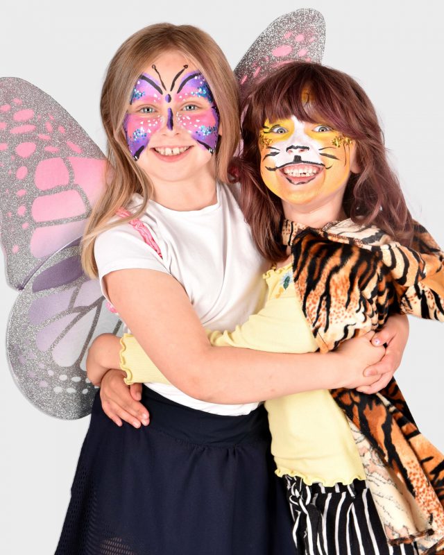 Todo el maquillaje facial y la purpurina se retiran fácilmente con agua y jabón, y el color del cabello desaparece con champú y agua.