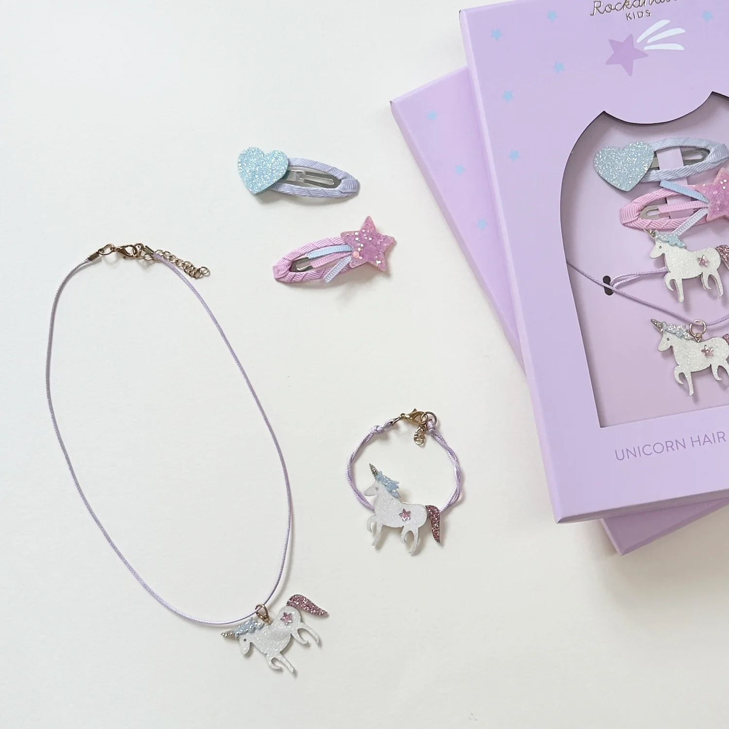 Añadir a la lista de DeseosCaja de regalo con clips de pelo y joyas de unicornio es el regalo perfecto! Incluye dos pinzas para el pelo con una estrella fugaz y un corazón, y un collar y una pulsera de unicornio con un brillo precioso. Cada set se presenta en una bonita caja de regalo del tamaño perfecto para regalar en un buzón.