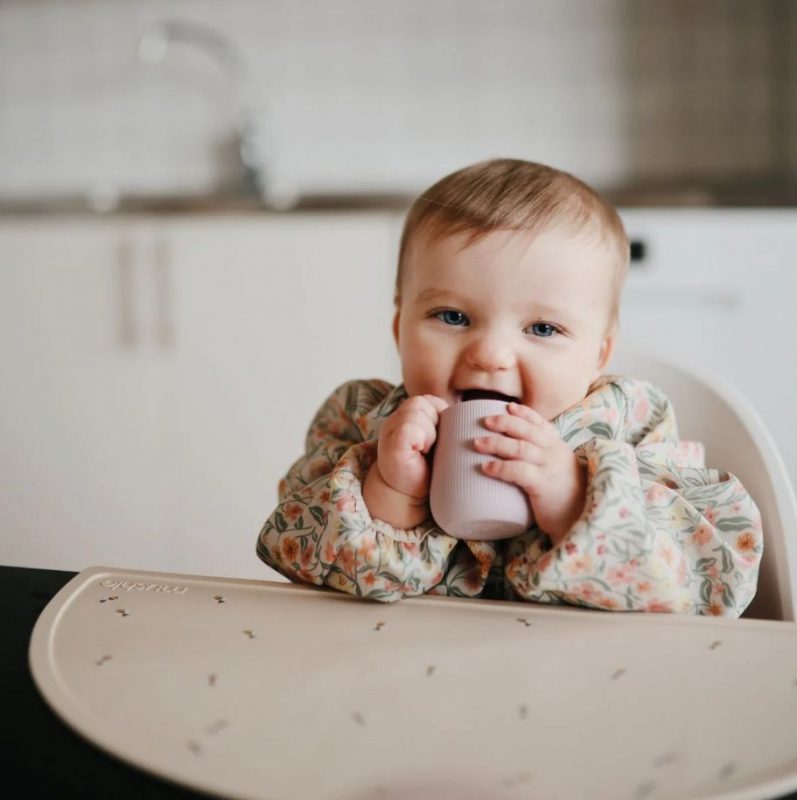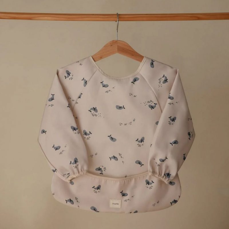 El babero tiene un cierre de velcro en la nuca que asegura un ajuste cómodo. El tamaño es adecuado para niños de 6 a 24 meses. El babero se limpia fácilmente con un paño y se puede lavar perfectamente en la lavadora.