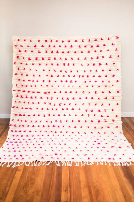Tintes de origen natural y fina lana cosechada de estas ovejas que habitan en el Atlas, son las únicas materias primas que participan en la producción de las mullidas alfombras, y hace de ellas las más buscadas y admiradas en el mundo de la decoración.Color: beige/fucsia