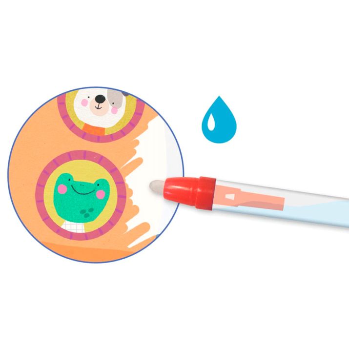 Llenando el bolígrafo de agua y pasándolo por las zonas en blanco de los dibujos, irán apareciendo los colores.