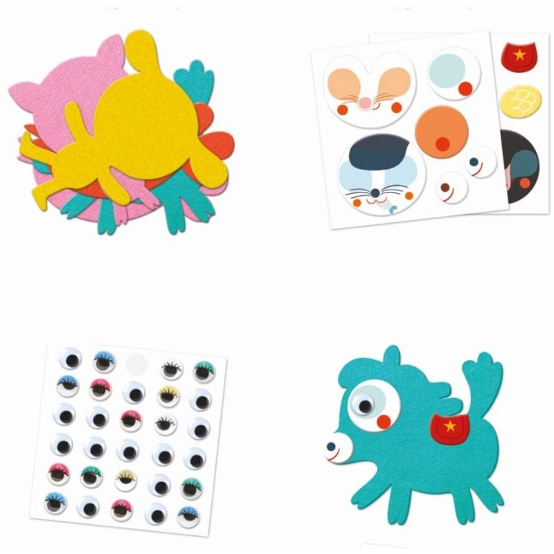 Una actividad de collage para crear bonitos animales autoadhesivos. El niño elige una silueta de un animal en fieltro y la decora libremente con las pegatinas de volumen y los ojos móviles. Los animales cobran vida, sólo queda pegarlos.