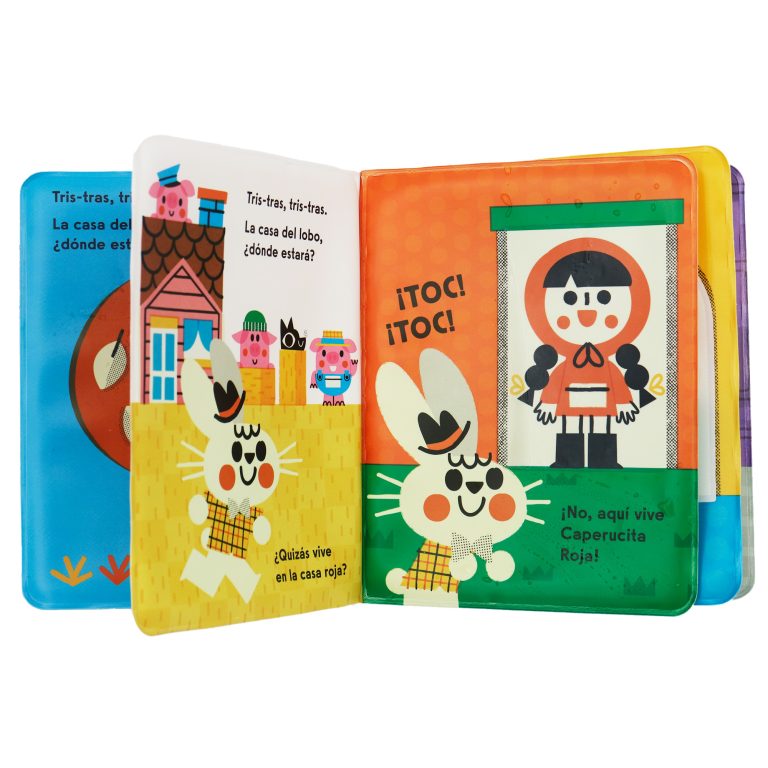 populares. Para encontrarlo, el conejito llama a la puerta de Ricitos de Oro, de los tres cerditos y de Caperucita Roja. Un libro de baño ilustrado por Pintachán, con elementos escondidos que quedan al descubierto cuando se mojan.