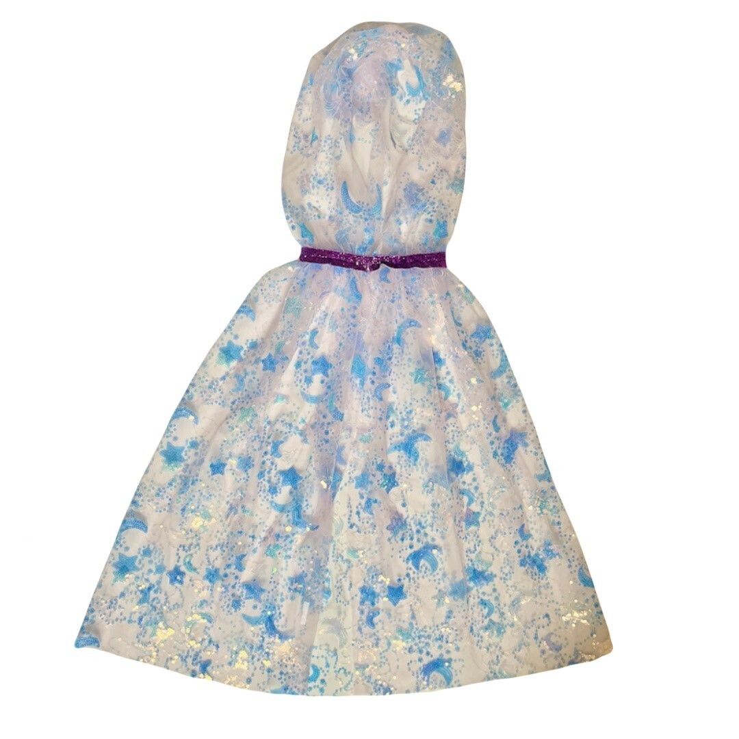Ligera, cómoda y con un toque brillante, la Capa lila luna es perfecta para jugar, bailar y crear aventuras galácticas sin límites.