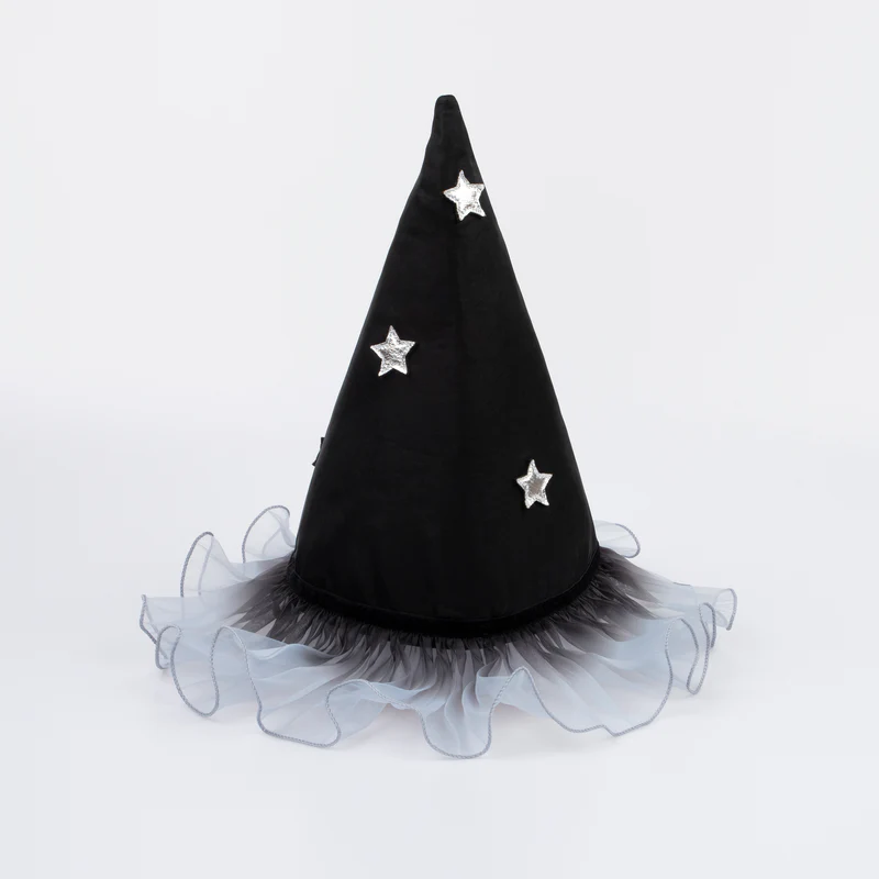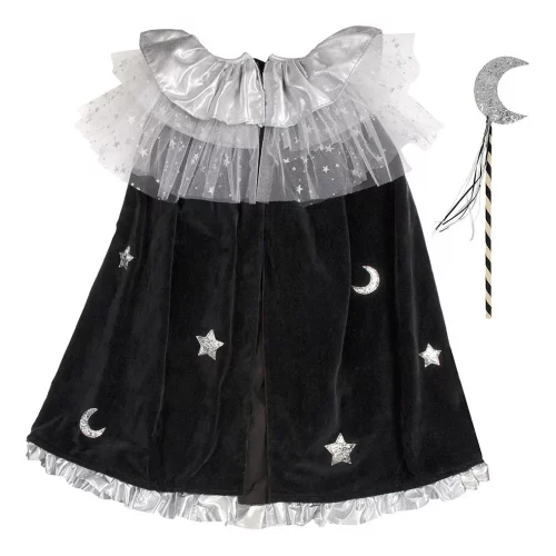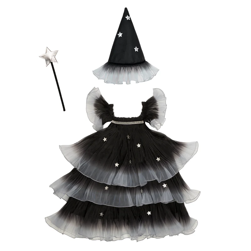 ¡Pliegues, volantes, estrellas de cuero sintético y un efecto ombré: este lujoso disfraz de bruja lo tiene todo! La combinación clásica de tonos negros y blancos con plata brillante garantiza un look espectacular. Este set de vestido, sombrero y varita es perfecto como un regalo de Halloween alegre y para horas de juego imaginativo después.