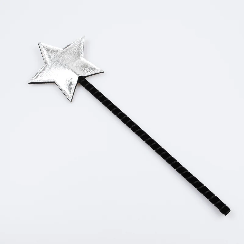- Una estrella de cuero sintético plateado texturizado, con un centro de fieltro, adorna la parte superior de la varita.