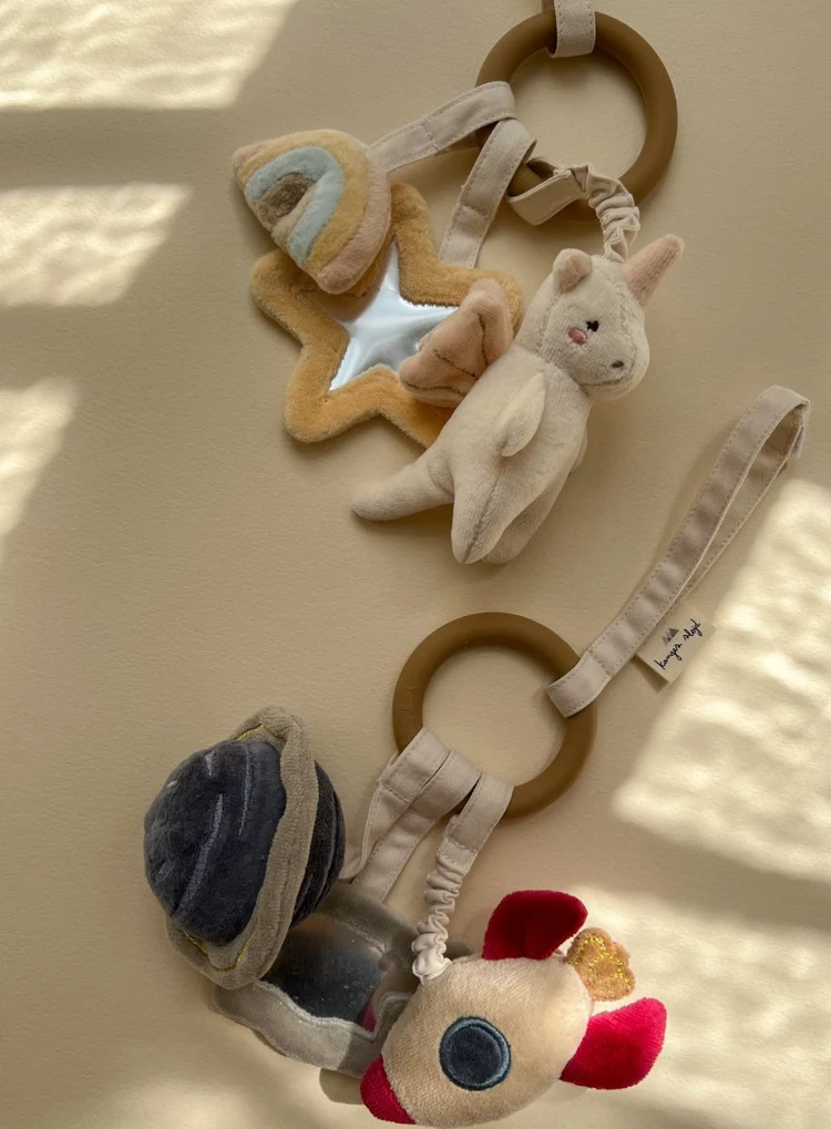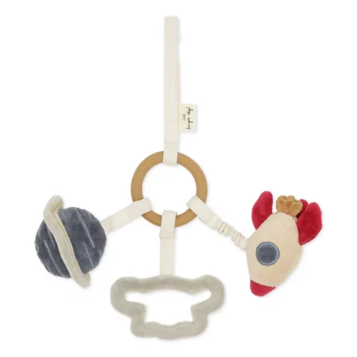 Añadir a la lista de DeseosAnillo de actividades fabricado en 100 por ciento de silicona, seguro para que los bebés lo muerdan. El anillo cuenta con correas de algodón orgánico con figuras suaves añadidas a ellas, hechas de algodón orgánico con relleno de poliéster reciclado en el interior. Una correa es elástica, una figura incluye un espejo de plástico y dos figuras emiten un suave sonido de timbre.