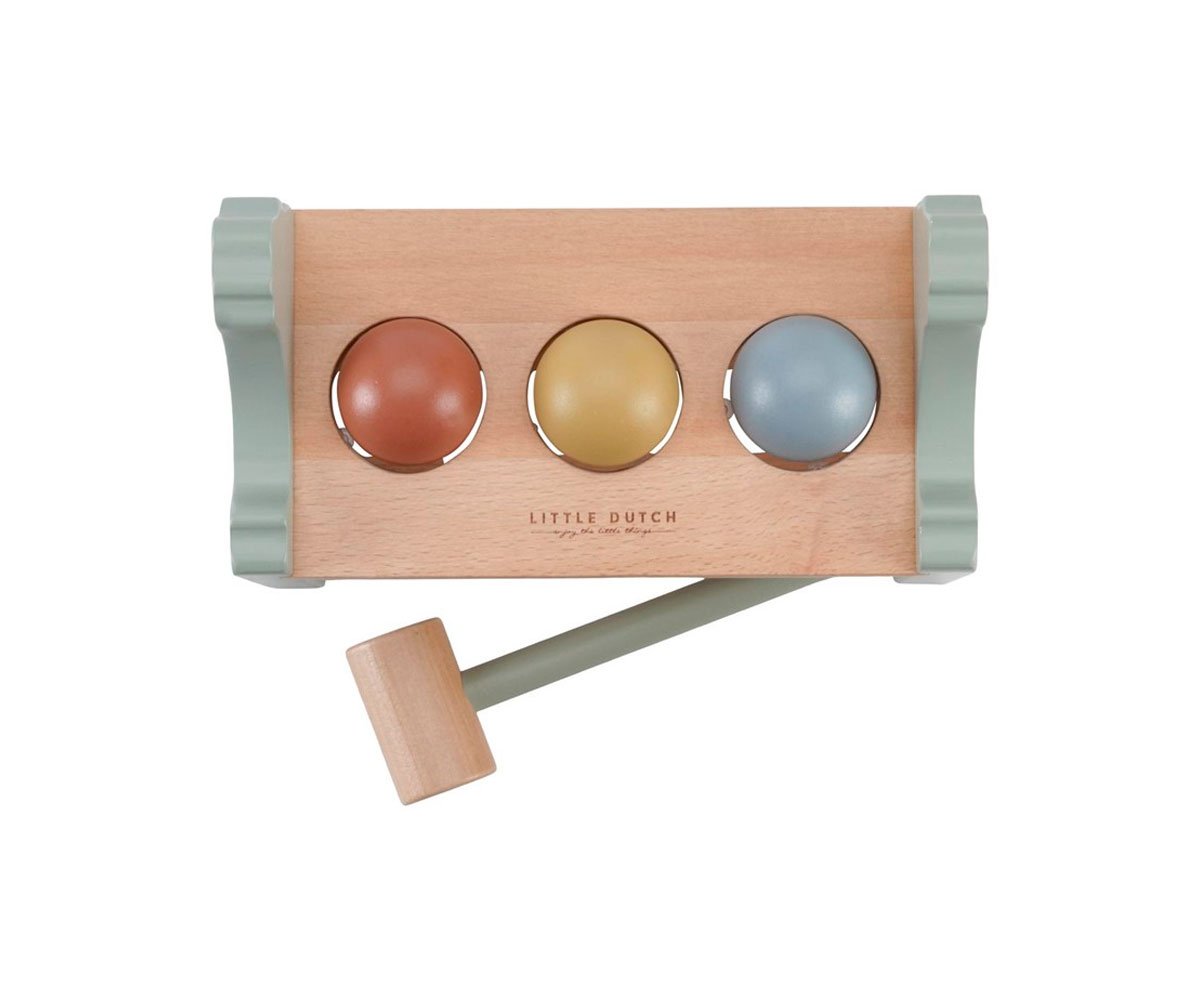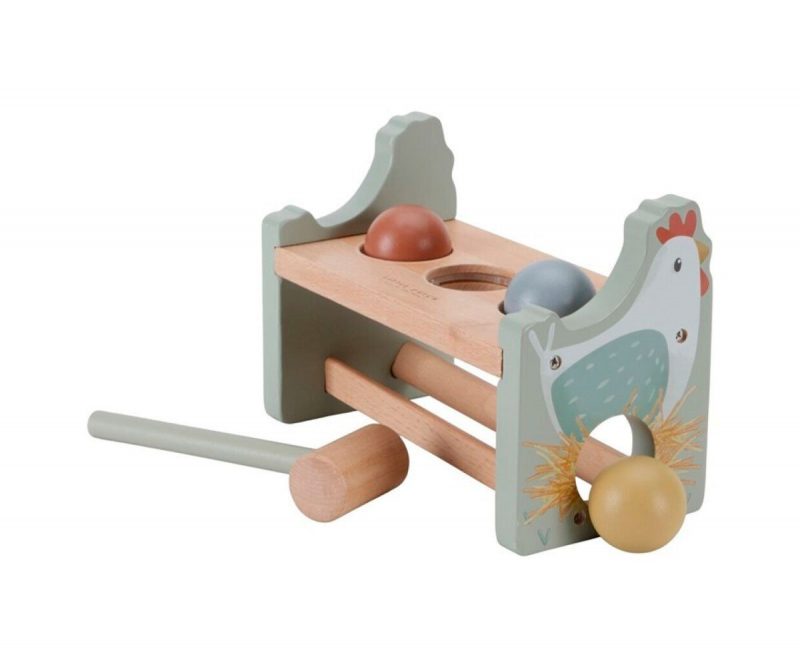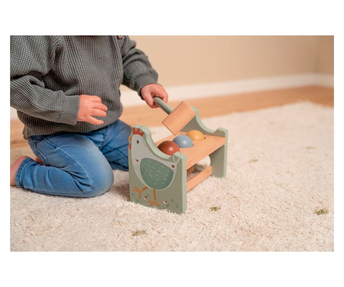 Añadir a la lista de DeseosHaz que la gallina ponga un huevo golpeando las 3 bolas en el banco de golpeo de madera con el martillo. Desarrolla las habilidades motoras de su hijo. ¿Han entrado todas las bolas? Vuelve a colocar las bolas y comience de nuevo.