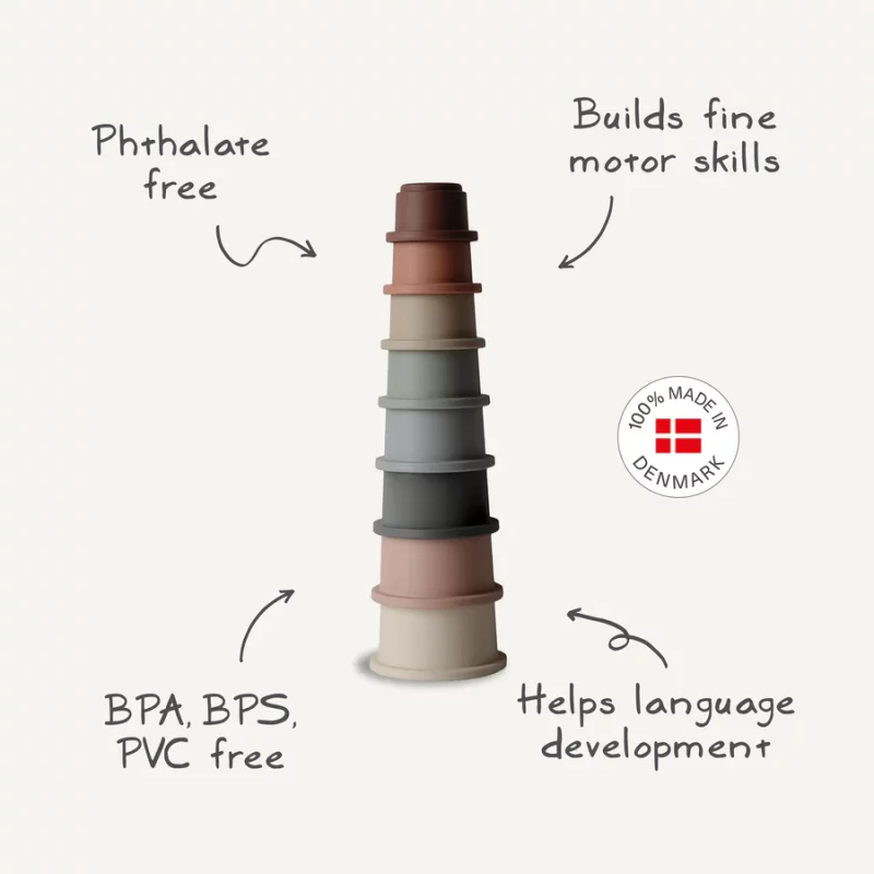 Apilar las piezas una a una les ayuda a desarrollar su organización y habilidades motoras. Las aperturas en la base de algunos de los cubos lo convierte en un juguete versátil, perfecto para jugar en la arena o en la bañera y desarrollar los sentidos.