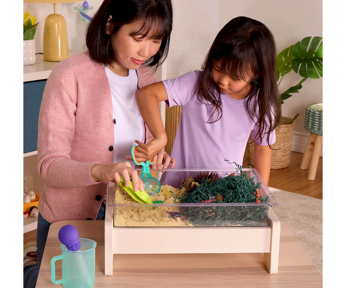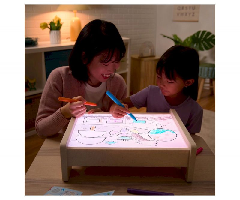La mesa de luz multifunción cuenta con una superficie iluminada en 5 colores diferentes e incluye 79 piezas para que los niños experimenten y jueguen.