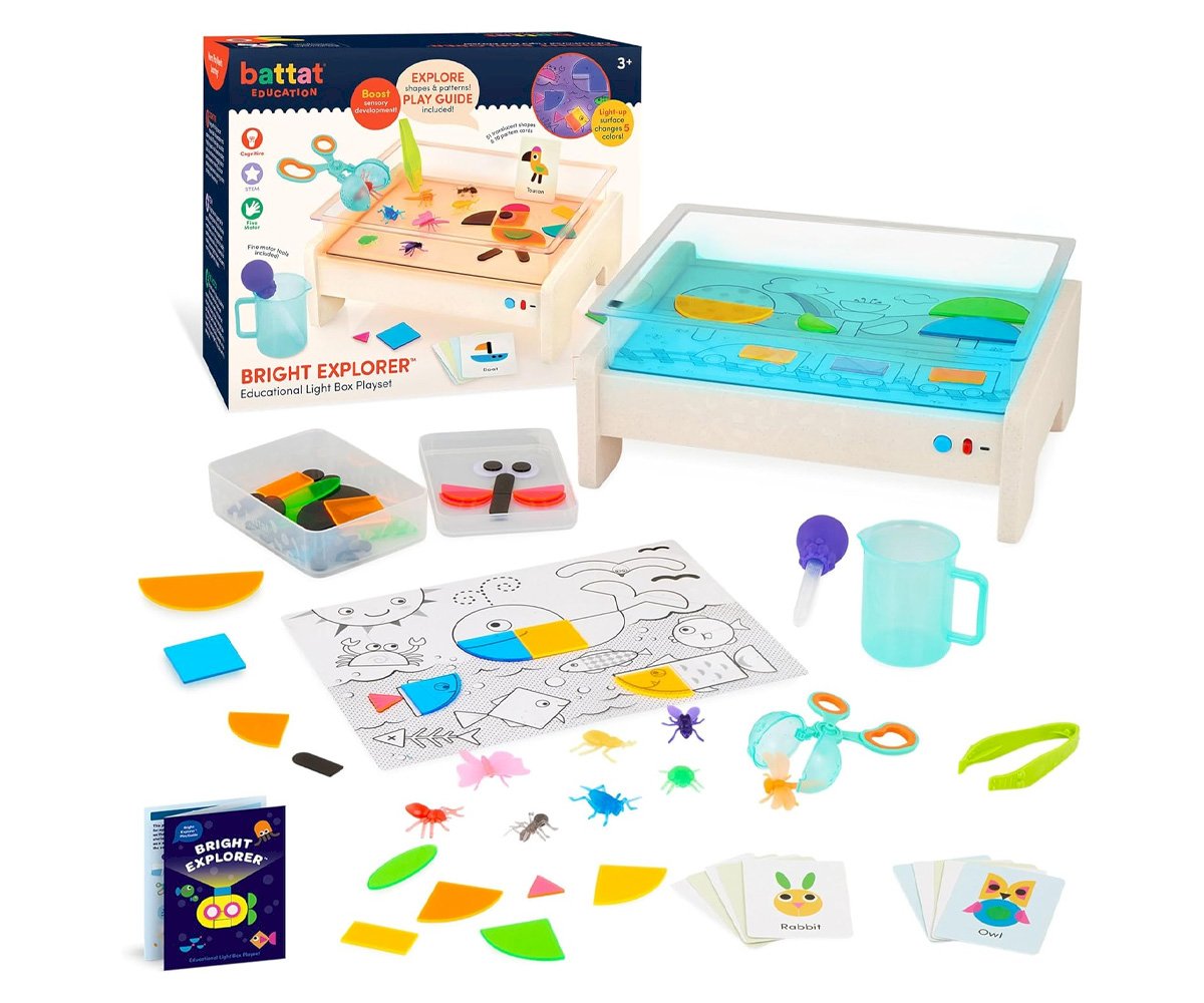 - Contenido de la caja:(79 piezas) 1 mesa de luz que cambia de color, 1contenedor sensorial, 2 hojas de transparencia, 1 par de pinzas, 1 cuchara,1 taza medidora,1 cuentagotas, 51 formas translúcidas,8 insectos translúcidos, 10 tarjetas de patrones, 1 contenedor de almacenamiento