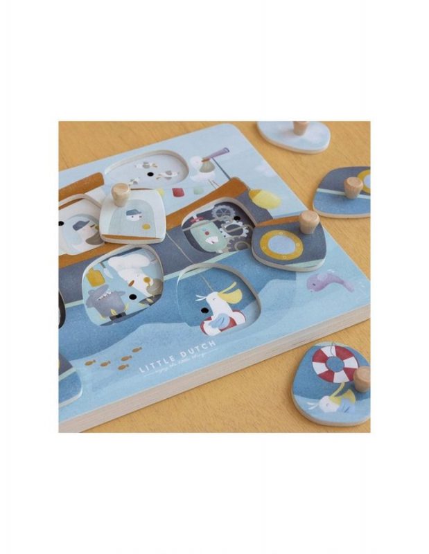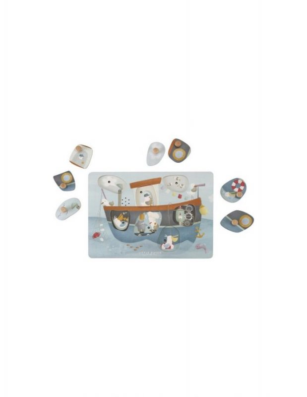 ¡Las gaviotas gritando volando alrededor para atrapar algunos peces! O el pelícano dormido en la cabina debajo de la cubierta. ¿Y quién es el que dirige el barco? ¡No olvides tocar la bocina cuando esté listo para comenzar! Este atractivo rompecabezas con 7 sonidos estimula la coordinación y el vocabulario. Los sensores responderán al levantar una pieza del rompecabezas y revelar la ilustración deabajo.