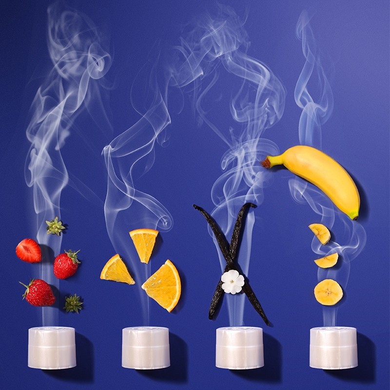 Aromas recreados a partir de ingredientes naturales y/o moléculas aromáticas: Azahar, Chimenea (fuego de leña), Océano, Grosella negra, Piña, Fresa, Hierba, Plátano, Miel, Lirio del valle, Madreselva, Rosa, Pomelo, Albaricoque, Jabón, Setas, Avellana, Melón, Coco, Violeta, Galleta, Manzana