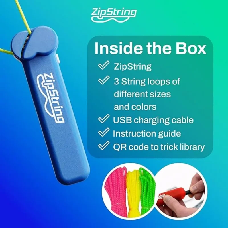 - Contenido: 1 dispositivo ZipString, 1 cuerda ZipString, cable de carga USB, manual ilustrado.