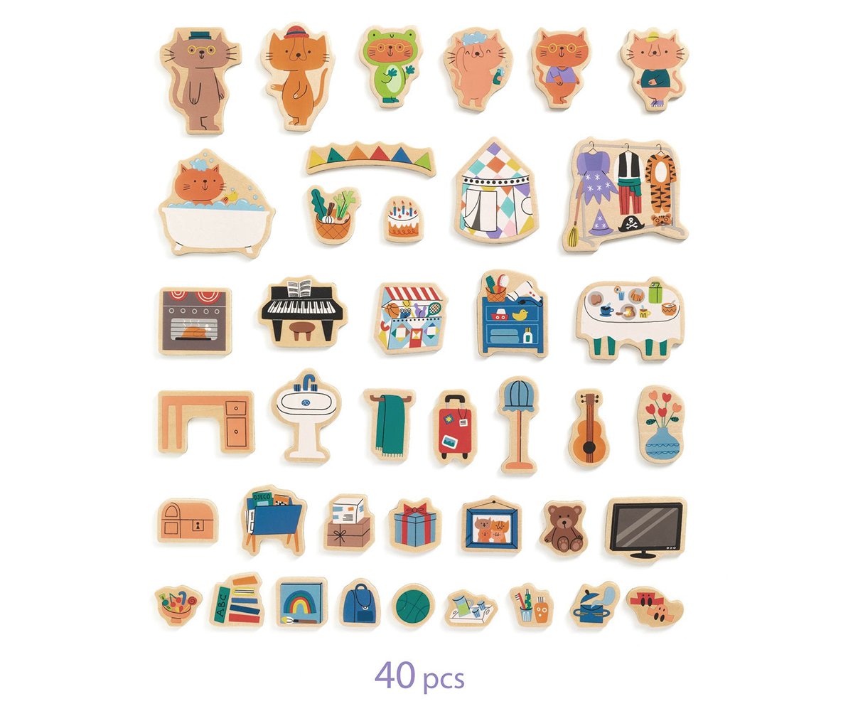 Encantadora caja metálica con forma de casita que alberga en su interior 40 piezas magnéticas de madera diseñadas para recrear escenas de rutinas diarias. Con seis simpáticos gatos como protagonistas, podrás inventar infinidad de historias en ambas superficies de la casita, favoreciendo la creatividad y el juego imaginativo.