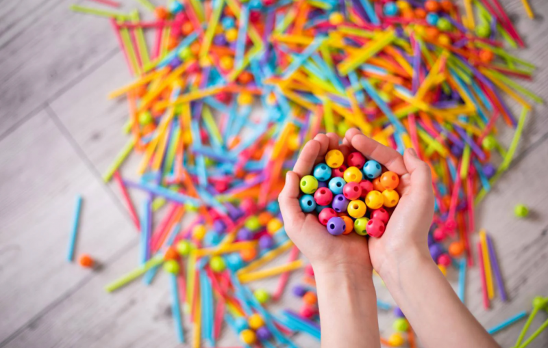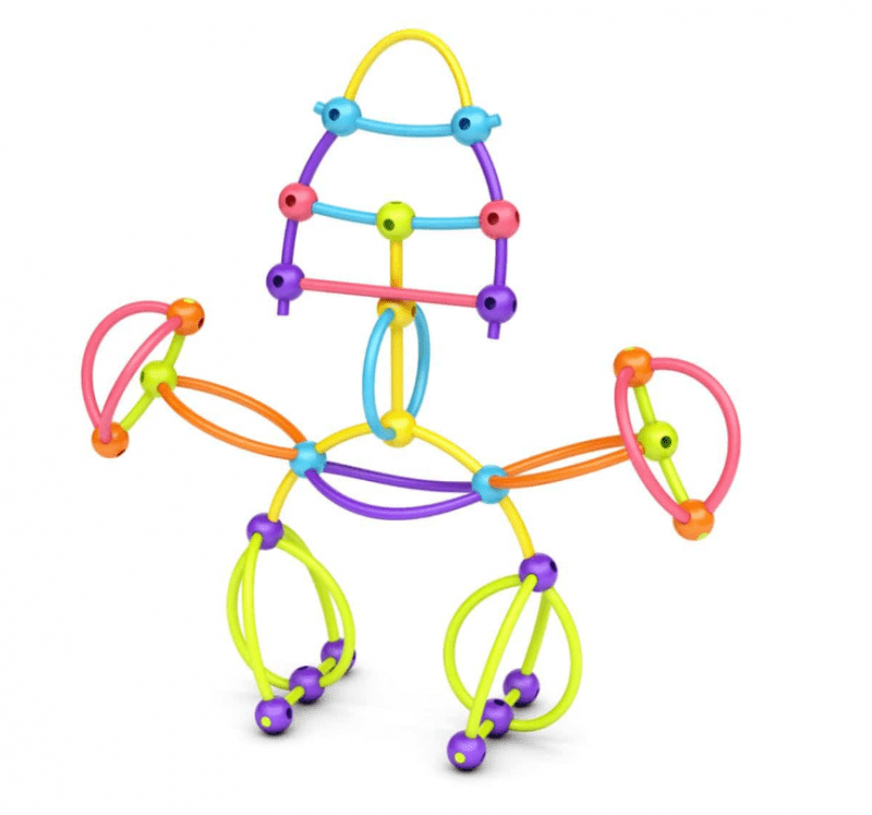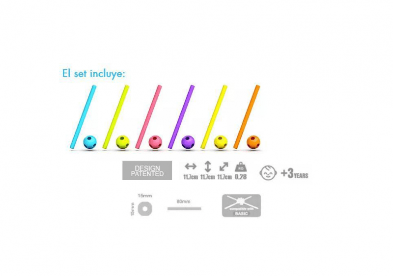 El set incluye bolas con agujeros y palos flexibles en seis tonos intensos: naranja, amarillo, azul, rojo, verde y rosa. Los niños pueden combinar las piezas para construir todo lo que se les ocurra: desde una mariposa hasta una tortuga… ¡o incluso una vaca!