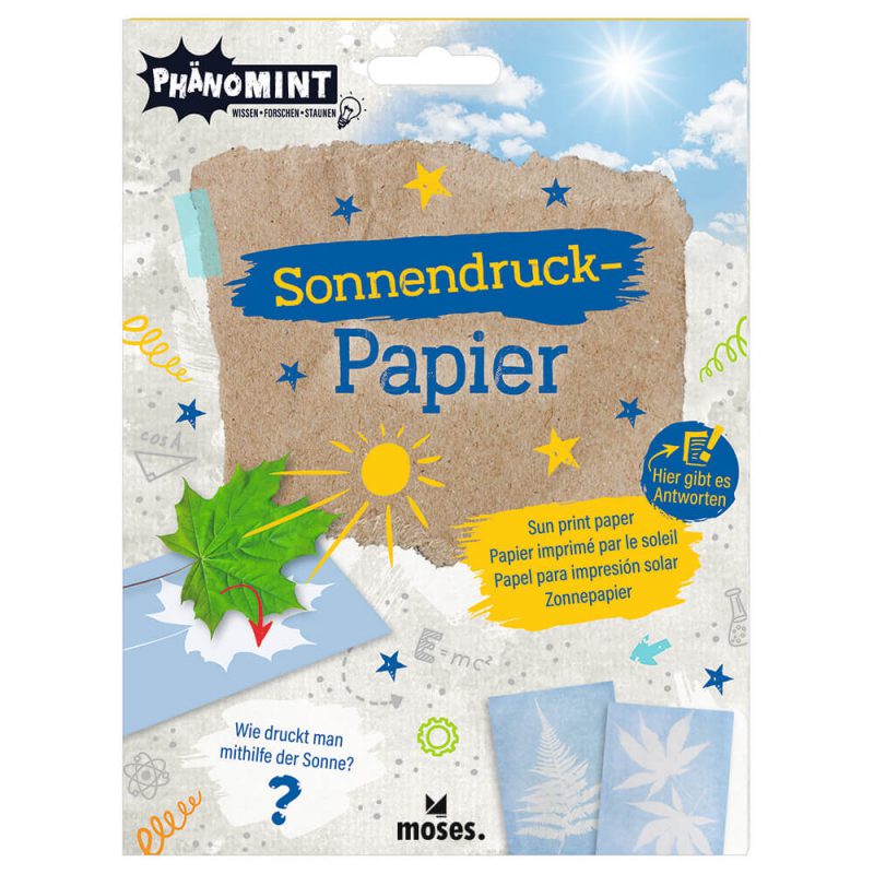 Este kit incluye 10 hojas sensibles a la luz solar, con las que se puede experimentar el fenómeno de la cianotipia: se colocan objetos sobre el papel, se deja al sol y luego se revela la imagen con agua. Viene con instrucciones sobre el proceso y explicaciones científicas.