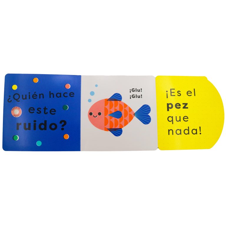 Un libro todo cartón, con solapas y sonidos en todas las páginas, y con un espejo como sorpresa final. Después de escuchar el sonido de