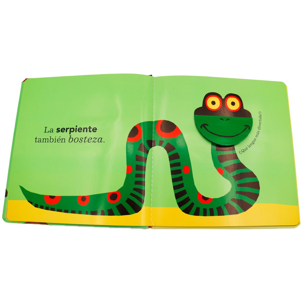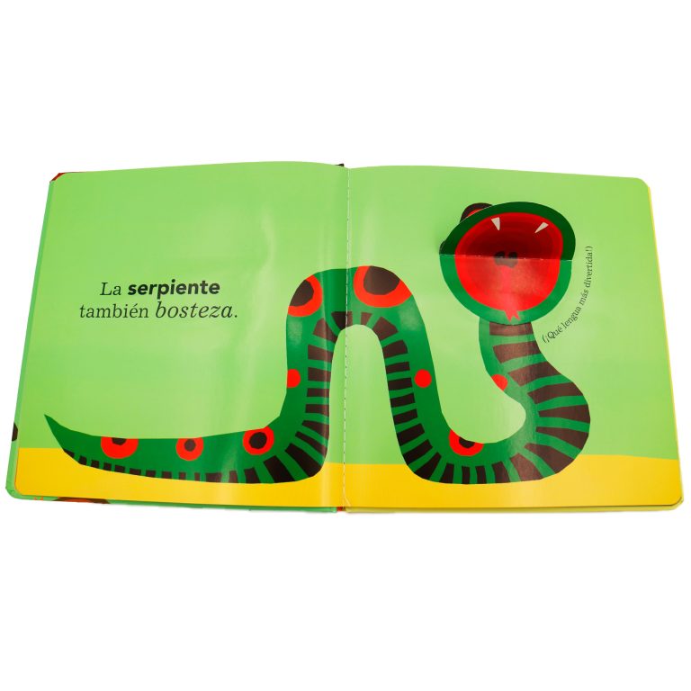 Cada doble página presenta a un animal que, bostezando, nos muestra su enorme boca mediante un mecanismo de solapa, hasta que al final… ¡todos duermen!
