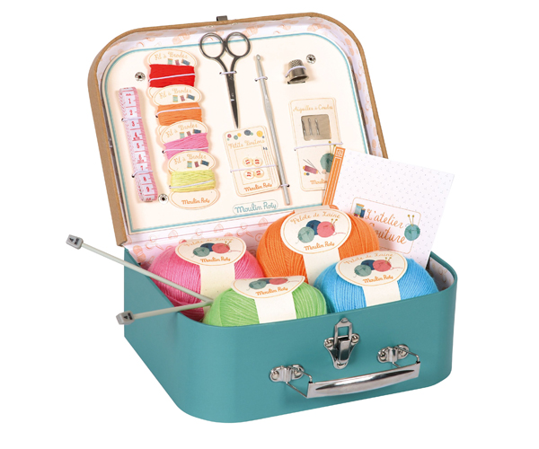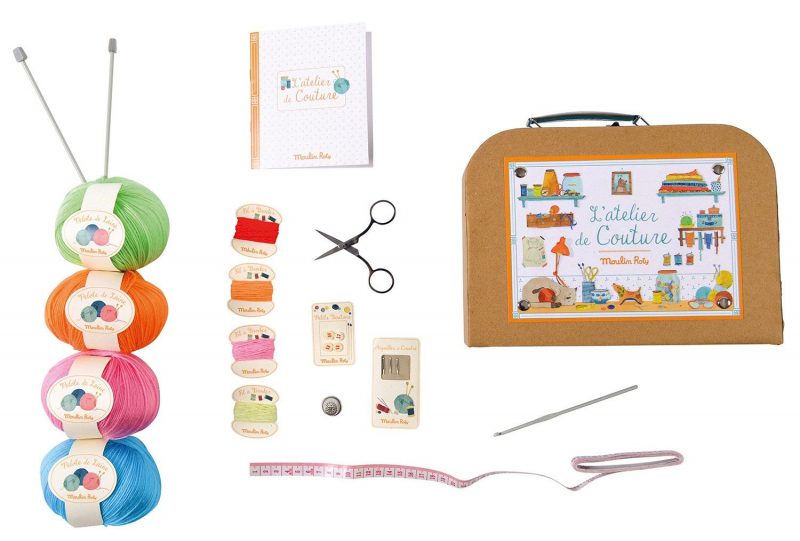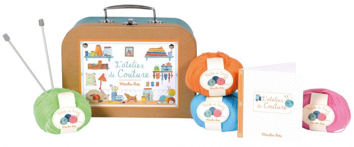 Incluye: 4 madejas de lana, 2 agujas de media, 1 aguja de ganchillo de 4mm, 1 dedal, 3 agujas de coser, 4 botones, 1 cinta métrica, 4 hilos de bordar, 1 tijeras de costura, 1 librito con instrucciones (en francés)