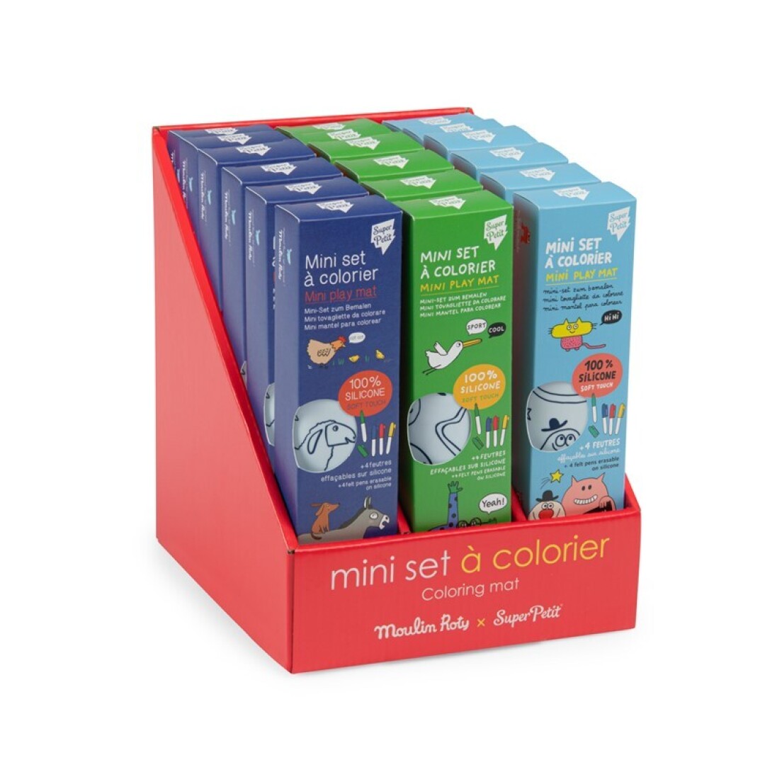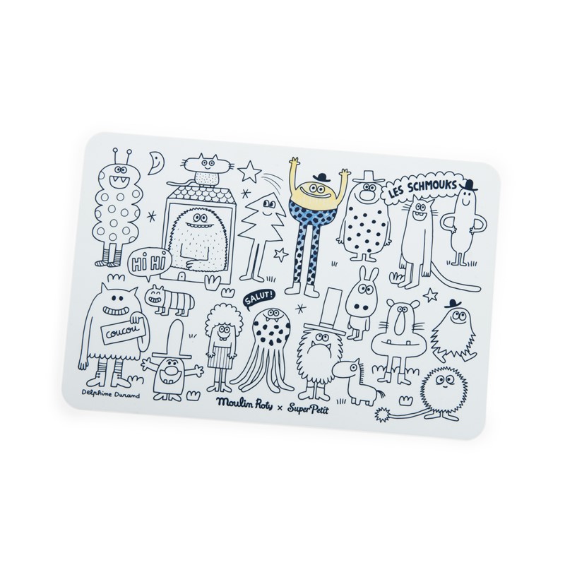 Colorea, borra y vuelve a empezar tantas veces como quieras con este mini set SuperPetit de silicona y sus 4 rotuladores. Un lado tiene un dibujo de los Schmouks, Deporte o Granja para colorear y el otro es para dibujar libremente. Fácil de transportar y limpiar con un paño seco o húmedo.