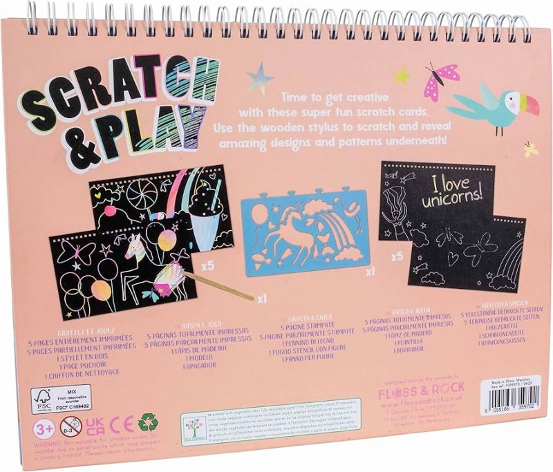 ¡Rasca y juega! Cuaderno con 10 tarjetas para rascar preimpresas que contienen preciosas ilustraciones de Fantasía: sirenas, mariposas, unicornios, arcoíris y más. Con el lápiz de madera incluido, puedes rayar para “colorear”, crear nuevas líneas o formas de colores. La tarjeta con plantilla incluida se puede sacar y colocar en cualquier parte del libro, lo que significa que puedes seguir las instrucciones para rayar formas de unicornios, arcoíris, flamencos y mucho más.