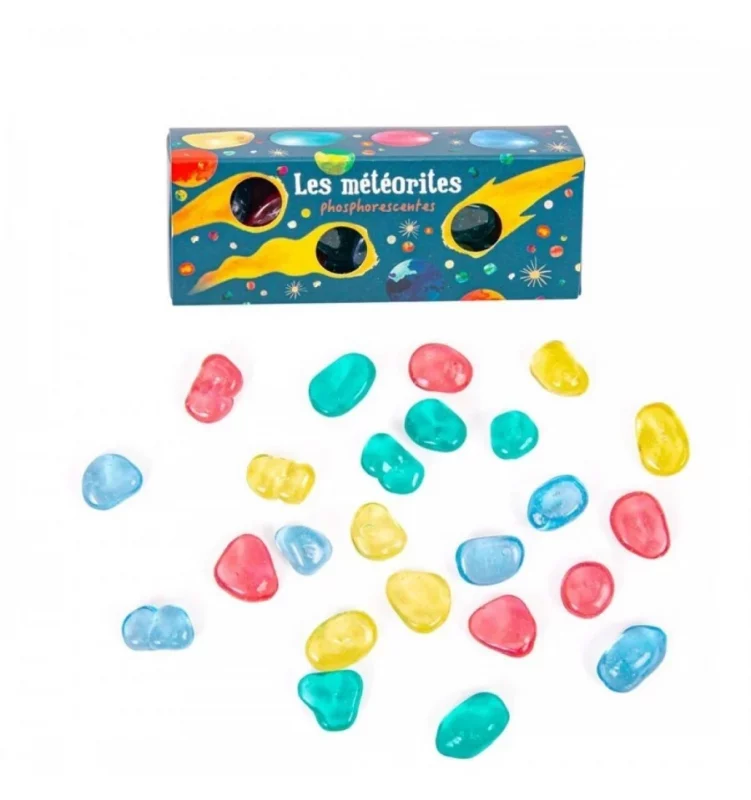 Añadir a la lista de DeseosMoulin Roty nos trae meteoritos extraterrestres que brillan en la oscuridad durante ¡8 horas! Amarillos, rojos y azules. Cárgalos con luz solar primero, y luego disfruta de los pequeños tesoros. También puedes usarlos como material de juego en las mesas de luz.