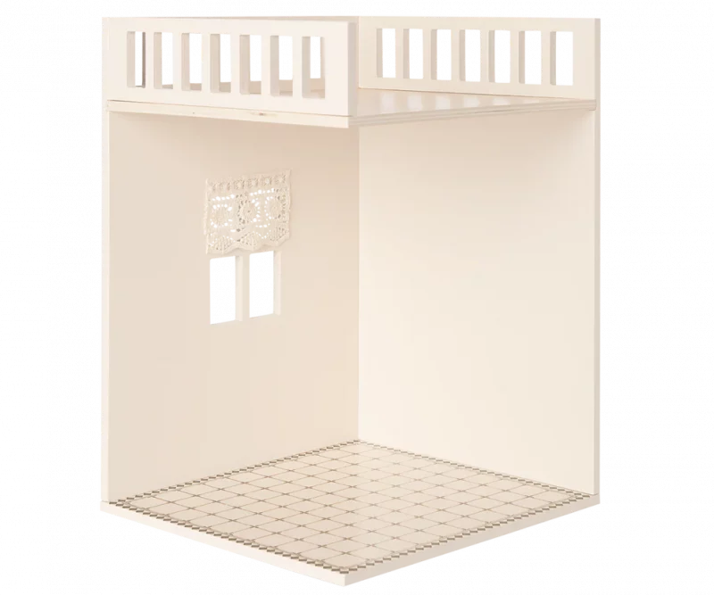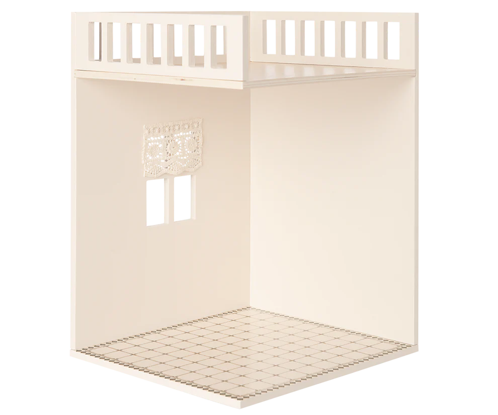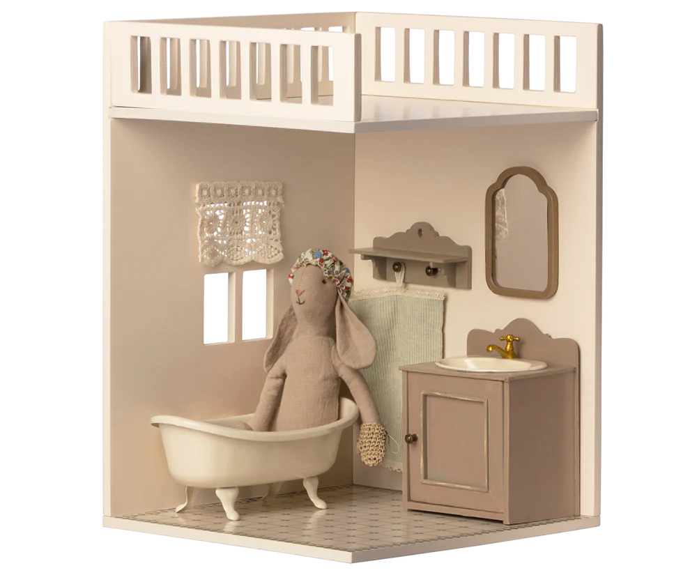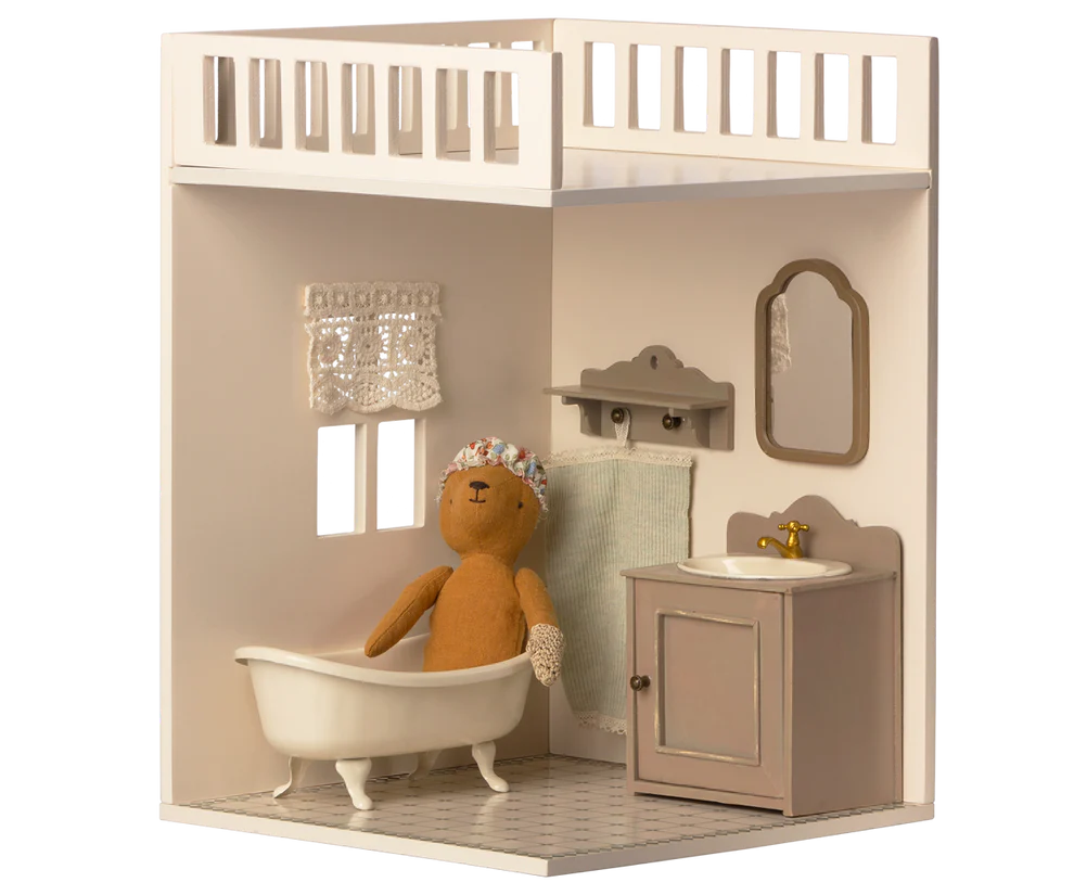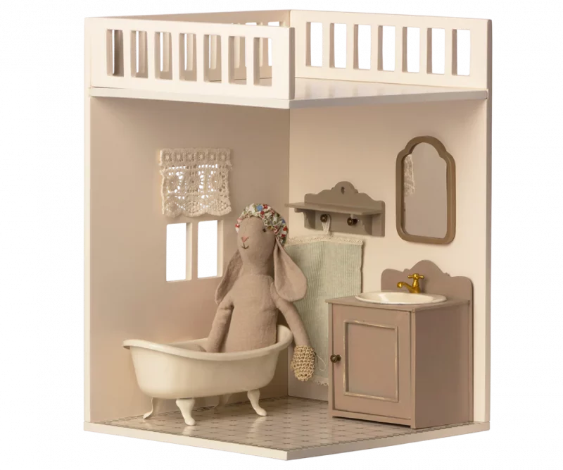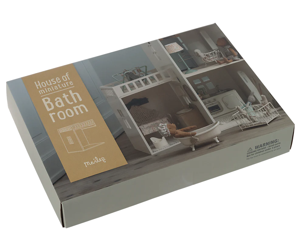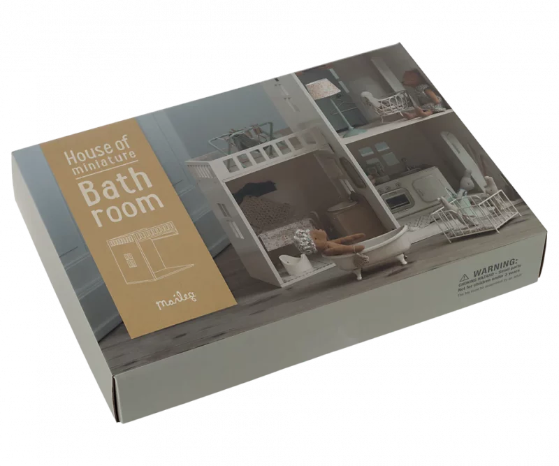 El baño en miniatura de Maileg cuenta con un precioso suelo decorativo. En la caja encontrarás dos pequeñas cortinas que ofrecen privacidad a tus amiguitos de Maileg mientras juegan.