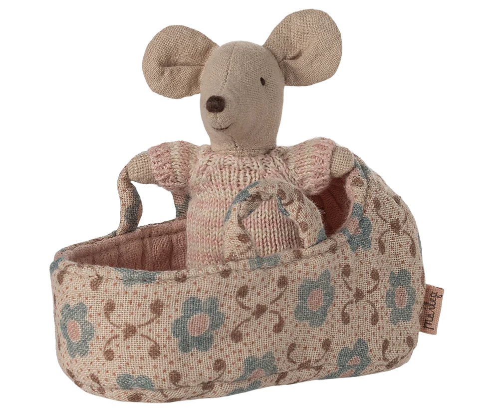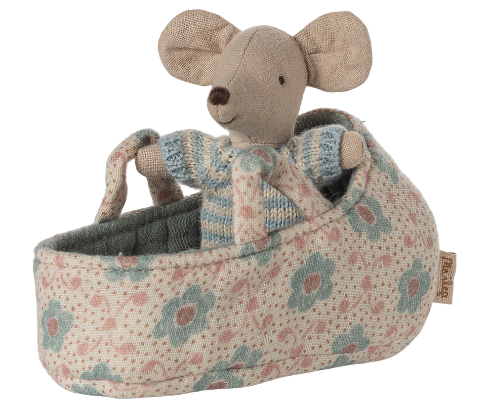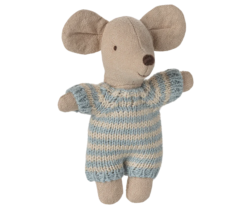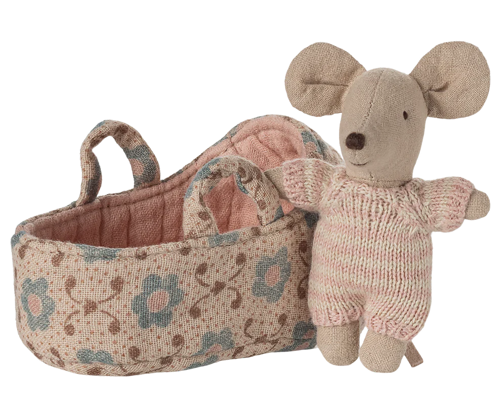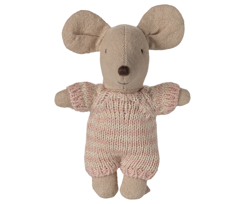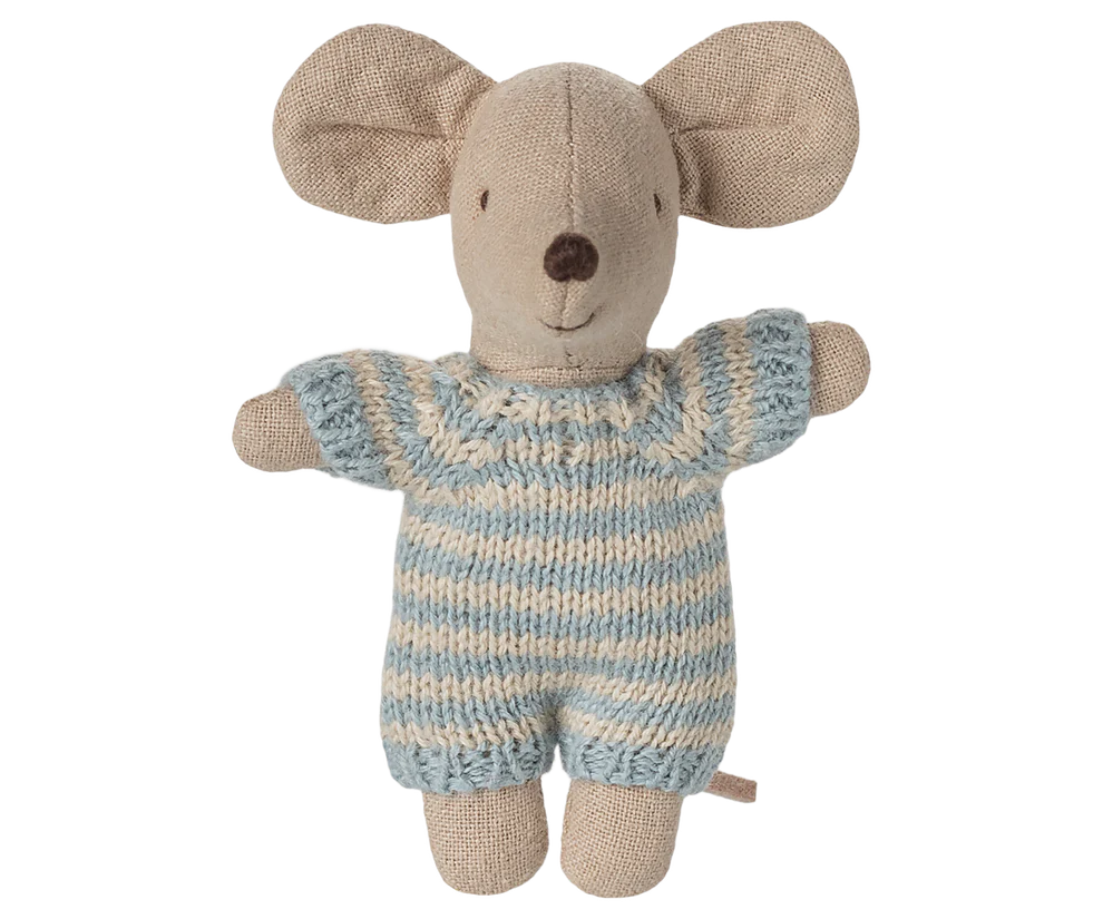 Un pequeño bebé ratón en un traje de punto suave rayado. Duerme durante horas en su pequeño capazo acolchado.