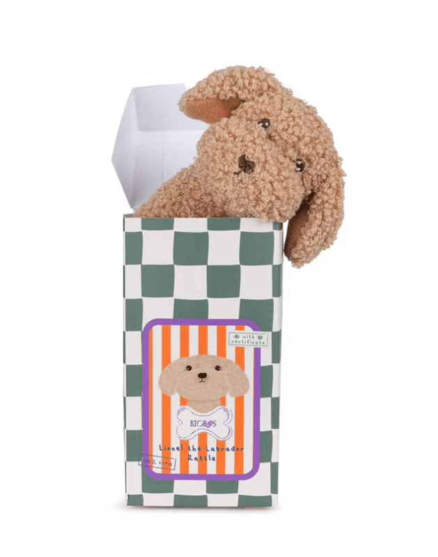 Peluche Lionel el Labrador sonajero en caja de regalo beige