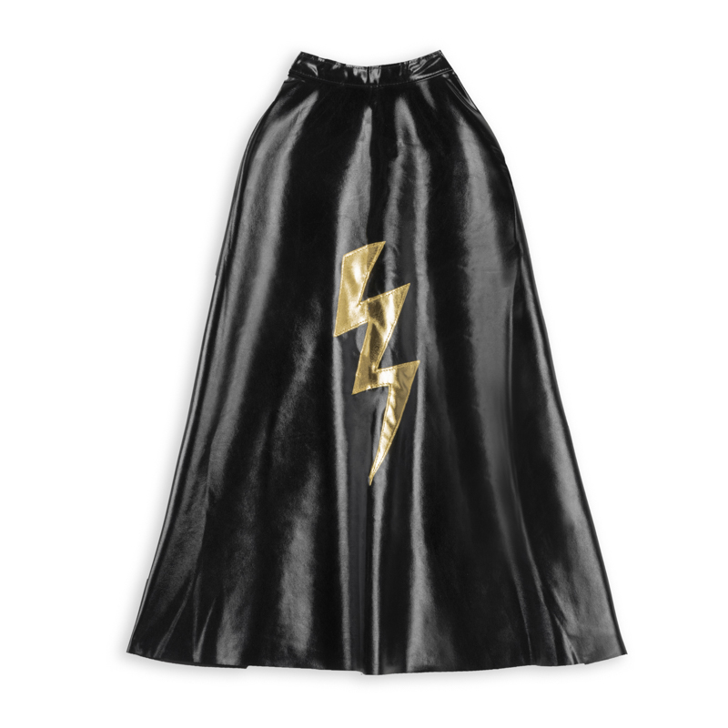 El set incluye: Capa con un rayo dorado en la parte trasera, 1 máscara negra y 2 muñequeras en color negro con rayos en color dorada.