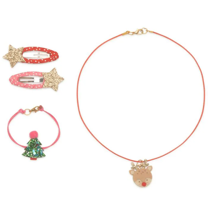 Añadir a la lista de Deseos¡Esta encantadora caja de regalo es el obsequio perfecto para Navidad! El set incluye dos pinzas con estrellas doradas de purpurina, un collar de reno y una pulsera de árbol de Navidad.