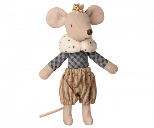 27,90€El príncipe ratón, vestido con sus mejores galas, está listo para jugar en el castillo. Características: Dimensiones: 13 cm de alto. Materiales: Algodón; relleno: poliéster reciclado y pellets. MAILEG
